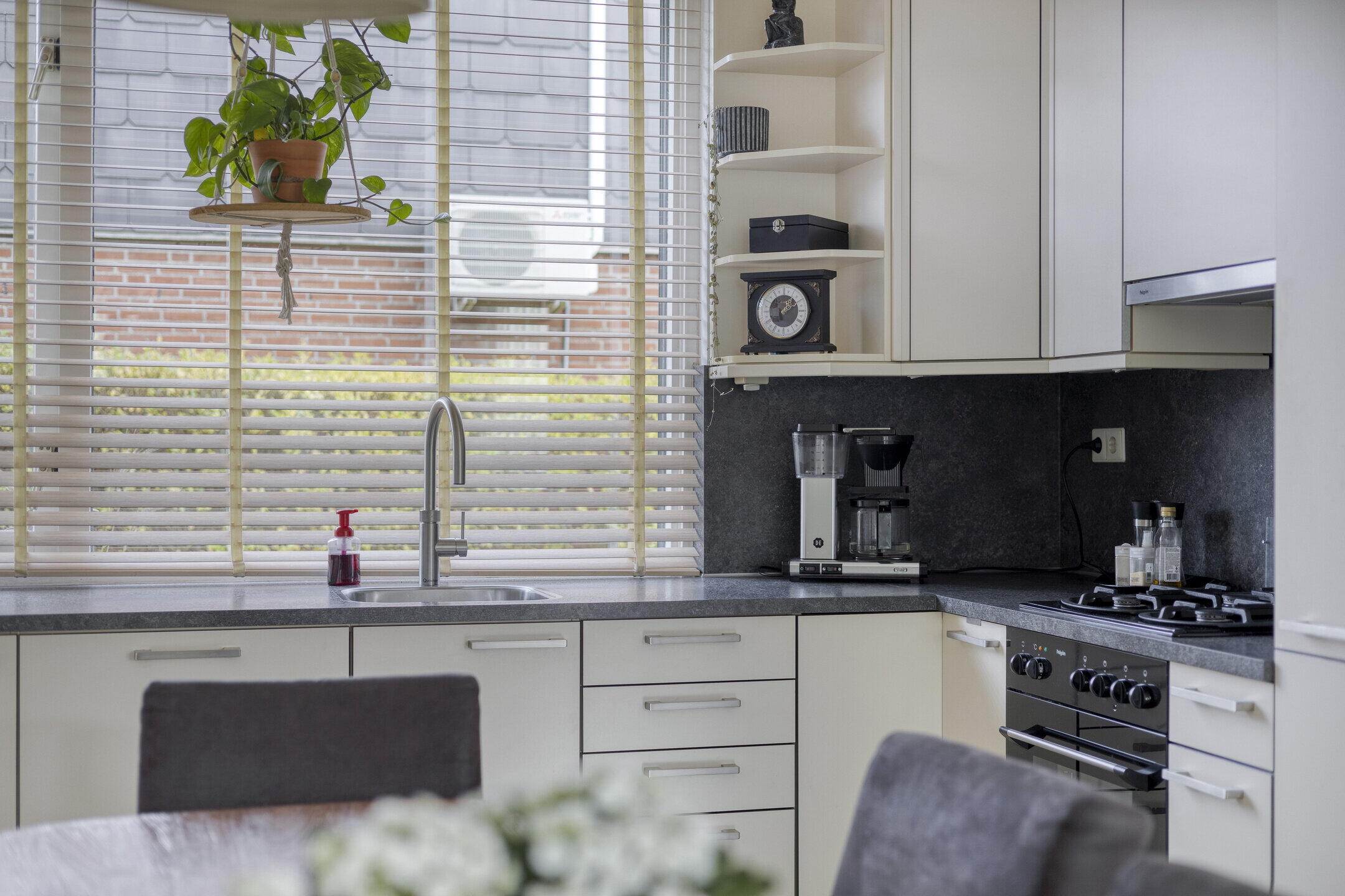 De open keuken is opgesteld aan de voorzijde van de woning. De keuken is oorspronkelijk geplaatst in 2004, maar in 2019 zijn de frontjes en het aanrechtblad vernieuwd. Tevens zijn toen de koel-vriescombinatie, afzuigkap en kookplaat vernieuwd. De keuken beschikt verder over een vaatwasser, oven en een vierpits gasfornuis.